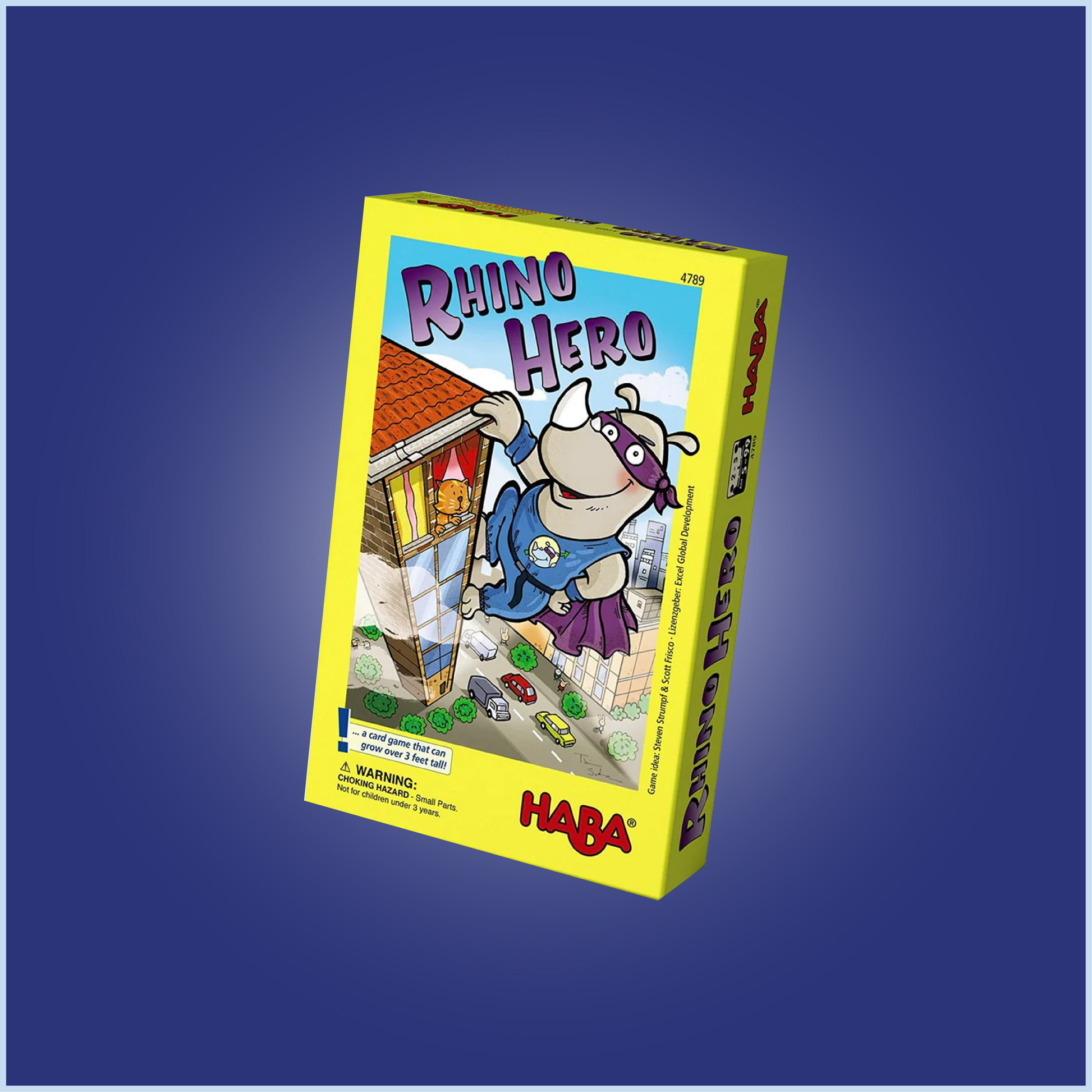 It's a bird! It's a plane! It's Super Rhino! No building too high, no street too dangerous for this caped crusader, as he scales buildings and patrols the city protecting the citizens. On his quest for safety, he must use caution as even the most solid buildings may start to sway and wobble. Can you help Super Rhino accomplish the challenge to build a skyscraper as tall and solid as can be? A heroic 3D card-stacking game for 2-5 players ages 5